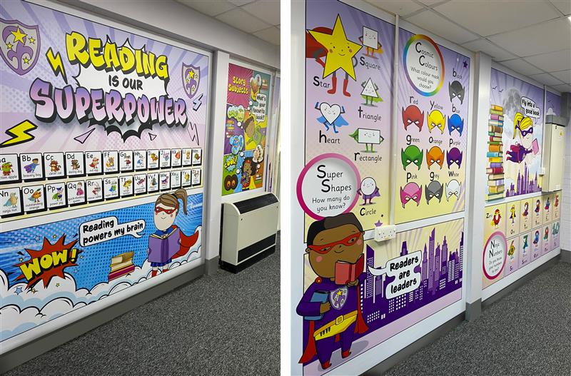 Our team worked closely with the school to design a series of bespoke wall graphics tailored specifically for the EYFS setting. Using original illustrations and playful themes, we developed a visual concept that supported early learning goals while adding energy and fun to the space. The designs included vibrant, age-appropriate elements like a “Reading is our Superpower” feature wall, along with illustrated alphabets, super shapes, cosmic colours, ninja numbers, story subjects, and reading adventures. Each design was crafted in bold, bright colours to capture attention and bring joy to everyday learning. From initial concept through to expert installation, we ensured every detail aligned with the school’s vision and practical needs.